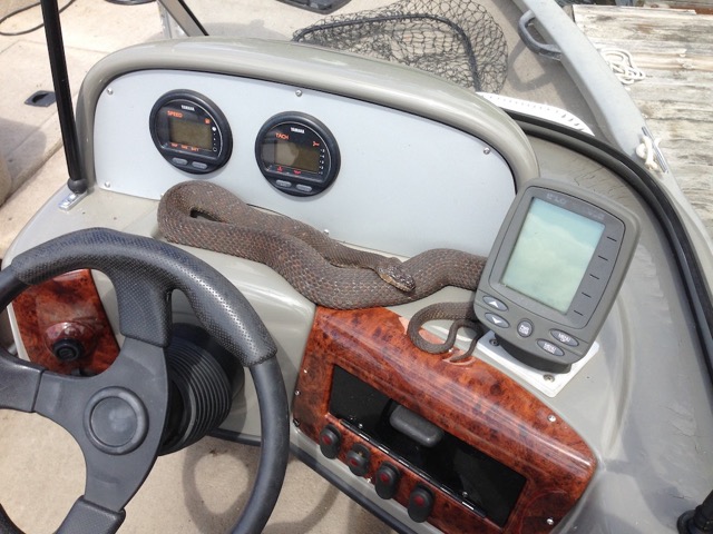 Reptila nu manifesta nici cea mai mică intenție de a evacua culcușul atât de comod. A început să se descolăcească alene sfidându-mă cu privirea și gustând aerul cu limba. Când a văzut că, desfășurat, șarpele măsura peste un metru, Eugen a renunțat la pescuit și s-a retras pe doc. Confruntarea s-a animat pe măsură ce soarele a încălzit sângele rece al reptilei care a înțeles că noi nu cedăm barca. A capitulat după câteva impulsuri date cu grijă de noi și a reușit să sară peste bord. Privindu-l cum se depărta unduindu-se, Eugen mi-a mărturisit că, dacă el descoperea șarpele în timp ce pescuia în larg, ar fi sărit în apă lăsând barca în voia valurilor.